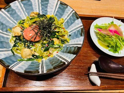 2025/2/2 三重県産抹茶の濃厚テリーヌチョコクッキー生地の上に濃厚抹茶!幸せ 京抹茶の生パスタ:ゆず香るホタテとほうれん草のたらこクリーム抹茶色のかみごたえのある生パスタ お子様おにぎりプレートハンバーグ、ポテトフライ、ブロッコリー、トマト、ゼ…