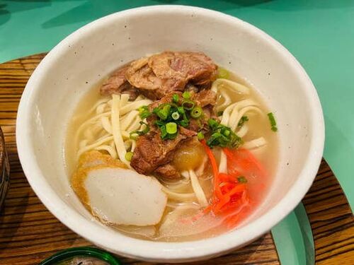 ソーキそば定食は、そばのスープを一口飲むと、かつおと豚骨の出汁が絶妙に合わさった深いコクが広がる。優しい塩味で、じんわりと体に染み渡る美味しさだ。麺はやや太めのちぢれ麺で、モチモチした食感が心地よい。 そして、主役のソーキ(豚のスペアリブ)…