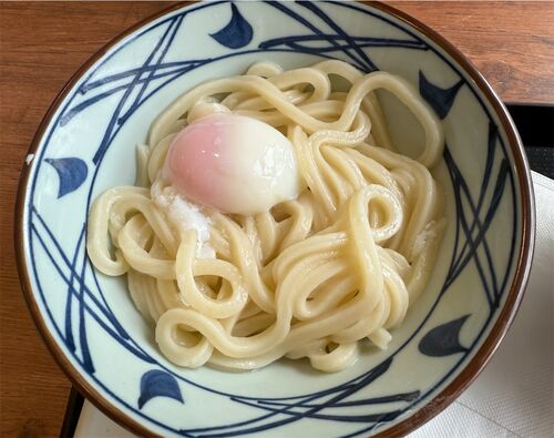 丸亀製麺オリナスモールでいただいたのは、讃岐うどんの王道ともいえる「釜玉うどん」。茹でたての熱々麺に温泉卵をすばやく混ぜ合わせ、そこにだししょうゆを垂らすだけのシンプルな一杯ですが、そのシンプルさこそが奥深さの源でした。 丼に盛られたうどん…
