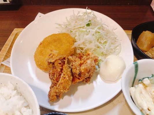 まず目を引くのがそのボリューム。大ぶりの唐揚げが3つ、ふっくらとしたコロッケが1つ、ごはんと味噌汁、小鉢が2つにお漬物までついて、なんとこの内容で800円!嬉しい悲鳴とはこのこと。