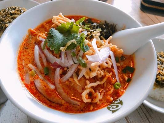 次に、カオソーイを試しました。タイ北部の名物であるこの料理は、ココナッツミルクベースの濃厚なカレースープに、茹で麺とカリカリの揚げ麺が組み合わさった一品です。スープの甘辛い味わいと、異なる食感の麺が絶妙にマッチしていて、一度食べたら忘れられない味です。