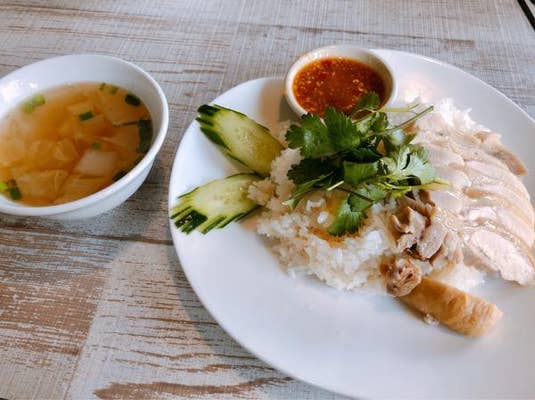 まず、カオマンガイをいただきました。鶏ガラスープで炊き上げたジャスミンライスの上に、柔らかく蒸し上げた鶏肉が乗っており、特製のタレが絶妙なアクセントになっています。鶏肉はぷりぷりで、ライスとの相性も抜群。クセが少なく、エスニック料理初心者の方にもおすすめです。