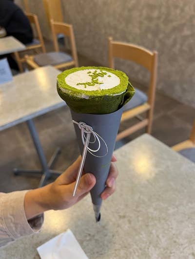 まず、掛川抹茶ティラミスをいただきました。このクレープは、100年以上の歴史を持つ静岡県掛川市の上質な抹茶を使用しており、抹茶の濃厚で奥深い味わいが特徴です。もっちりとした抹茶生地の中には、滑らかな抹茶クリームがたっぷり詰まっており、一口食べるごとに抹茶の芳醇な香りとほろ苦さが口いっぱいに広がります。特に、クレープの上部にはブリュレが施されており、パリッとした食感とキャラメルの甘さが抹茶の風味と絶妙にマッチしていました。