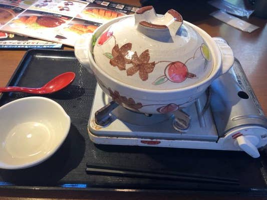 寒い日には、味噌煮込みうどん☆コンロでグツグツ5分ほど待つと卵がいい感じに♪ スープが余ったので白米を追加でオーダーしておじやにしてみたらもちろん合う♪ 16時という半端な時間のさとは、客2組。