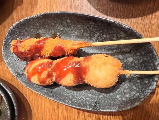 お肉だけでなく、串カツやタコの唐揚げ、鯛焼きなど、サイドメニューも充実しているのが嬉しいポイント。特に海老串揚げは、衣の甘さと海老のプリプリ感が絶妙にマッチしていて、思わず2本もおかわりしてしまいました。本当に美味しかった!