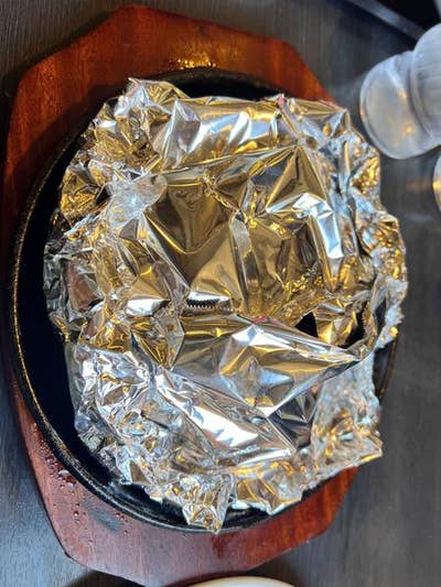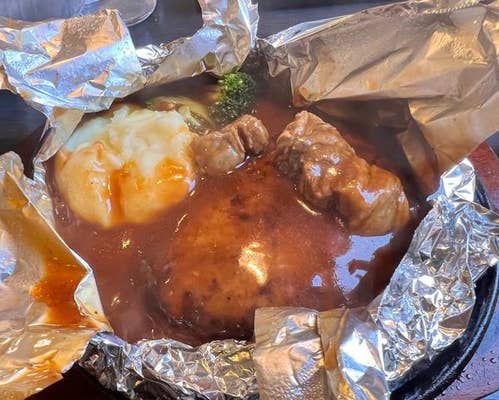 うまっ!文明開花ハンバーグ☆ホイルを開けると、ビーフシチューにステーキまで乗ってる♪ やわらかジューシーハンバーグ カインズの巨大モール内、実家と子どもと寄る。