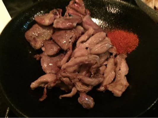 さて、今回の目当ては「さつま揚げ」と「やきとりの盛り合わせ」。まずはさつま揚げが登場。これが想像を遥かに超えるビジュアルで、なんとたこ焼きの倍くらいのサイズ感!丸くてふっくら、箸を入れると中からふわっと湯気が立ちのぼり、真っ白な生地が顔をのぞかせます。揚げたて熱々を一口頬張ると、外側はほんのり香ばしくカリッ、中は信じられないほどふわっふわ。魚のすり身の旨みと甘み、そしてほのかな生姜の香りがふわっと鼻に抜けて、気がつけば頬がゆるんでいました。