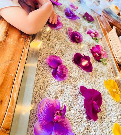 カウンターは白い小石にお花が綺麗♪ スタッフは現地の方だろうか?こどもに話しかけてくれる優しいママ