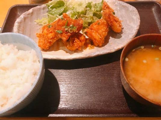 今回いただいたのは、日替わりAの鶏の唐揚げ定食。運ばれてきた定食セットには、こんがりと揚がった唐揚げがドドン!外はカリッと中はジューシー、下味がしっかり染み込んでいて、噛むごとに鶏肉の旨味がじゅわっと広がります。衣も厚すぎず、サクサクの軽やかさが嬉しい。