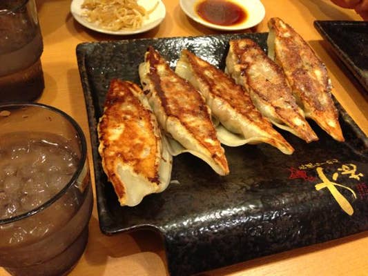 生姜入りのスープは ひむろ ほど濃厚ではないが、麺にインパクトがあるのでバランスいいと思う♪ 燻たまが、独特!うまい! チャーシューも燻製っぽいが好きだ〜 そして15cmの巨大餃子!ひとつで三つ分はあるので注意! しっかりもっちり美味しいです♪ この餃子をひとり二個ずつはきつかった、、お腹いっぱい! テーブルのピリ辛もやしをつまみながら待ちました。