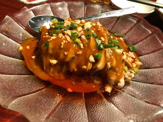 そして「よだれ鶏」。しっとり柔らかな鶏肉に、濃厚で香り高いタレが惜しげもなくかけられている。花椒のしびれる辛さと、香味野菜やラー油の香ばしさが重なり合い、舌の上で踊るよう。ピリリとした刺激の後に、ほのかな甘みと旨みが追いかけてきて、もう一口…と箸が自然に伸びる。このバランス感覚、まさに中華の醍醐味だ。
