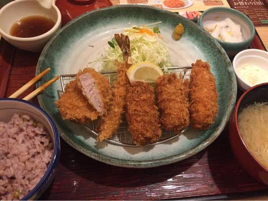 北上尾の「かつ敏」でいただいたのは、揚げたてサクサクの「4種盛り定食」。梅紫蘇、海老、ミルフィーユ、そしてプレーンと、バリエーション豊かな揚げ物が一度に楽しめる贅沢なセットです。衣は軽やかでサクッと歯切れがよく、中の具材はそれぞれ違った魅力を放っていました。梅紫蘇はさっぱりと爽やかで、揚げ物の重さを感じさせず、海老はぷりっとした弾力と甘みがたまらない。ミルフィーユは層になった豚肉が驚くほどやわらかでジューシー、プレーンはシンプルに肉の旨味を楽しめる王道の味わいでした。