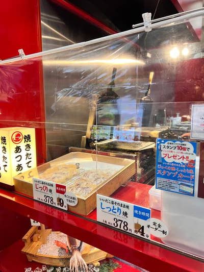 他にも「甘えび踊り焼」「ほたて姿焼」など海鮮尽くしのメニューが並んでいて、どれも立ち止まった人が興味津々に眺めていました。お店の外装は和の趣をほどよく残しつつも清潔感があり、ガラス越しに作業風景が見られるのが楽しいポイント。実演で焼いている様子が視覚でも食欲をそそり、つい何か買いたくなります。