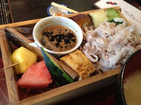 鮮やか~黒豚の野菜蒸しセット☆豚しゃぶうま!とろけるやわらか~♪ 肉の隣にサツマイモ&カボチャと別皿で蒸しチラシ寿司があるので炭水化物MAX! さらに特大お椀の豚汁付! 大満足♪ ランチは大混雑だが、お店も広いので少々待てば良し。
