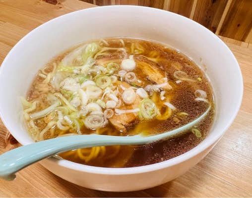 そしてセットの「半ラーメン」は、量こそ控えめながら存在感はたっぷり。スープは鶏ガラベースで、あっさりしつつもコク深い味わい。麺は中細のストレート、つるつると喉越しよく、スープとの相性もバッチリ。トッピングはシンプルにチャーシューとネギだけですが、逆にその潔さが美しい。まるで丼の“名脇役”としての役割をしっかり果たしていました。