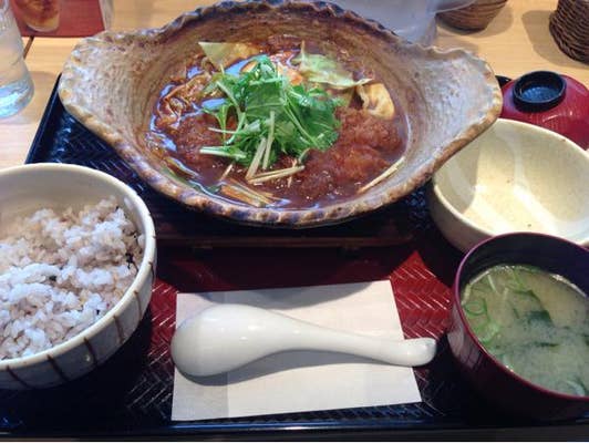 安心の大戸屋で、みんな大好き味噌カツ煮ですよ♪甘いぞ八丁味噌☆ ご親切に、表示カロリーは1132wwひぇ〜〜 んまぁ、今夜の皇居2周でカバー? カウンターだったけど、隣の席と間があってゆっくりくつろげる♪