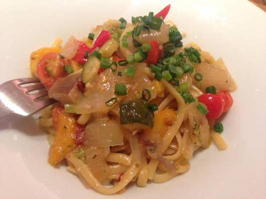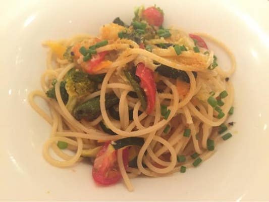 カラフル野菜にニンニクも効いてて食欲そそるパスタ。