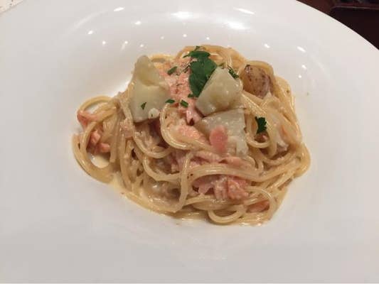 リゴレットキッチン新橋は、ランチでもディナーでも訪れるたびに新しい発見がある大好きなお店です。ランチでは1000円で前菜やサラダ、一口ワインまで付いてくるパスタセットが定番で、会社の新人歓迎ランチはほぼここでやってきました。奥の個室を押さえて大人数でワイワイ楽しむのにも便利。パスタはトマトソース系もクリーム系も外れなしで、特にタコのプッタネスカやアマトリチャーナは印象深く、太麺のもっちり感が絶妙。ボリューミーなのにペロリと食べてしまうバランスが魅力です。