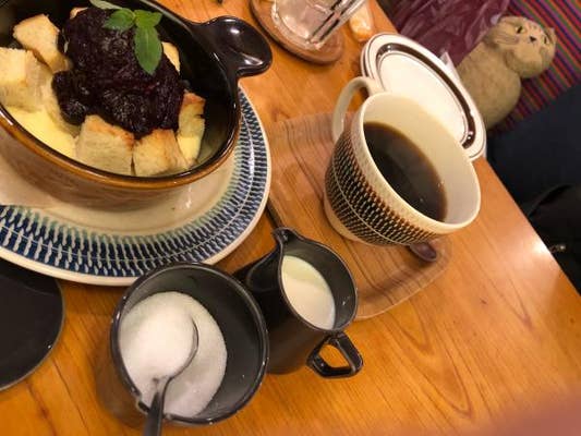そして、食後のデザートには「デザートパングラタン」を。温かいグラタンに冷たいアイスとブルーベリーがトッピングされていて、その組み合わせが意外にも相性抜群なんです。甘酸っぱいブルーベリーと、濃厚なアイス、そして温かいグラタンの組み合わせは、まるでサプライズ!最後まで飽きさせない工夫が凝らされています。