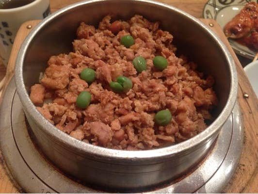 お焦げ的な部分をしゃもじで引き剥がすのが楽しい美味しい♪ やきとりは生かと思うくらい柔らかくイキイキしてる。