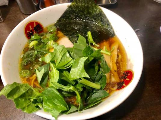 醤油ラーメン☆ランチは大盛り、ネギ、ほうれん草と選べるのだが、健康を意識してほうれん草に♪安定の醤油スープ。