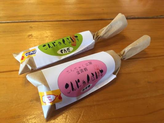 ショーケースには、色とりどりのこんにゃくアイスがズラリ。「定番のバニラもいいけど、ここはやっぱり福島名物のずんだでしょ!」というわけで、「大人のずんだ」味をチョイス!