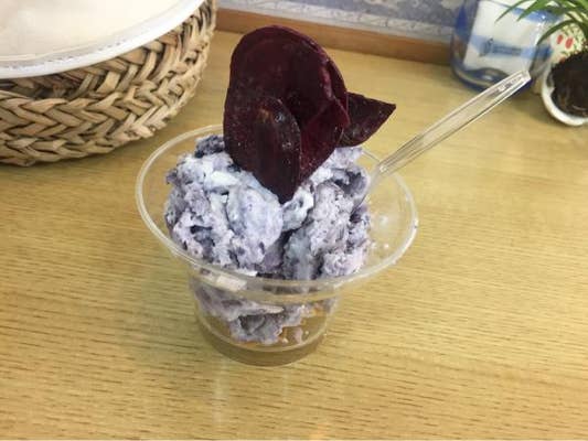 そして忘れちゃいけないのが、てっぺんにドーンと刺さる紅芋チップス!分厚めでパリッパリ、揚げたてのような香ばしさ。アイスと一緒に食べれば、ホクホク×カリカリの新食感が完成して、これがまた楽しい。ビジュアル的にも映えまくるし、観光の合間にテンション上がるスイーツタイムにぴったり。