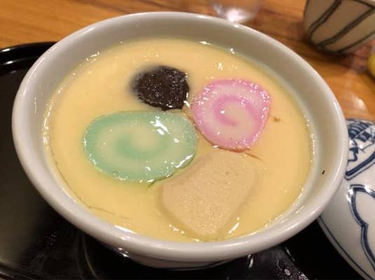 まず、そのサイズ感!写真で見てはいましたが、実物は想像をはるかに超える巨大さ。普通の茶碗蒸しの3倍はあるでしょうか。まるで小さな丼のような器に、プルプルと輝く茶碗蒸しがたっぷり。一口食べると、まず口いっぱいに広がるのは、優しい出汁の風味。上品な甘さと、卵のふわふわとした舌触りが絶妙にマッチしています。具材は、鶏肉、椎茸、三つ葉など、シンプルながら素材の味がしっかり感じられ、出汁の風味を邪魔することなく、むしろ引き立てているのが素晴らしい。