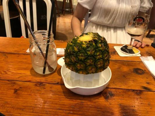 そして、もうひとつ忘れられないのが「パイン搾り」。テーブルで大きなパインをくるくると搾り、生の果汁を目の前で注いでくれる演出は盛り上がること間違いなし。フレッシュな甘酸っぱさがアルコールと合わさり、飲み口が爽やかになるので、飲み疲れた体にも嬉しい一杯になります。お酒の場でこういう遊び心のあるドリンクがあると、会話もさらに弾みますね。