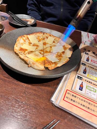 もちろん、アラカルトメニューも充実しています。ワンオーダー制なので、まずは「ワインの味がするピザ」をチョイス。本当にワインのような香りがして、日本酒との意外なマリアージュに驚きました。チーズ好きにはたまらない「チーズのパリッとしたやつ」や、あおさの風味が食欲をそそる「あおさあんかけ豆腐」もおすすめです。特にあおさあんかけ豆腐は、出汁の優しい味わいと豆腐のなめらかさが絶妙で、日本酒が進むこと間違いなし!